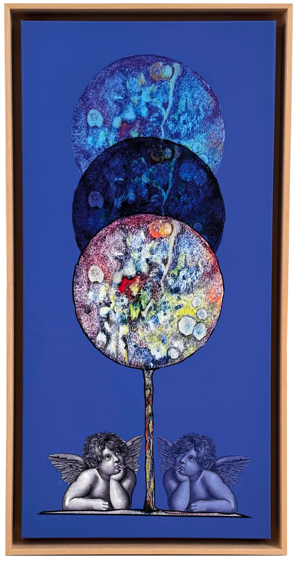 "In this work, the play of reflections and the balanced composition aim to connect the real with the illusory world. A cherub contemplating a perfect cosmic tree that multiplies itself provokes a reflection on the grandeur and, at the same time, the fragility of Nature."